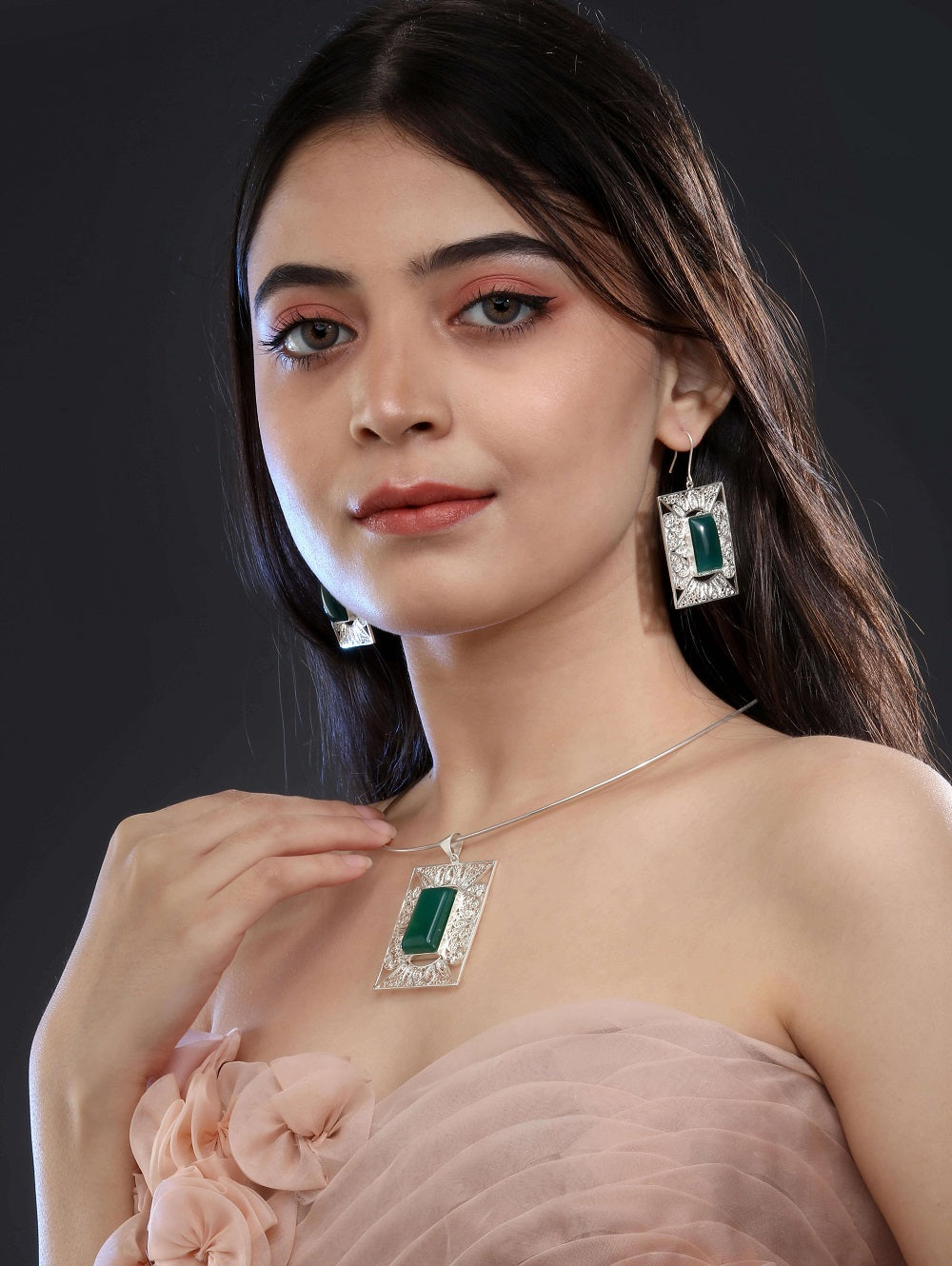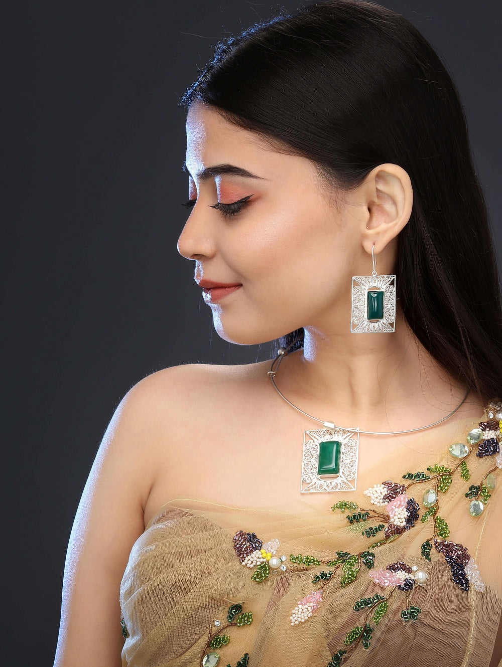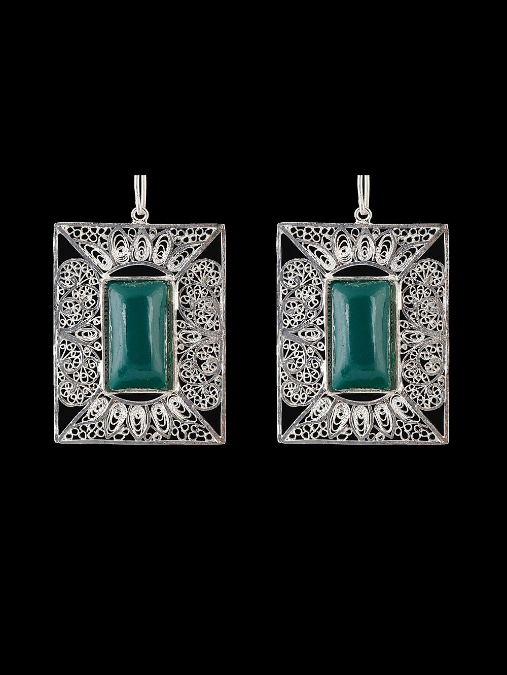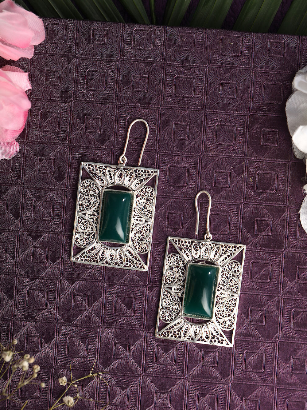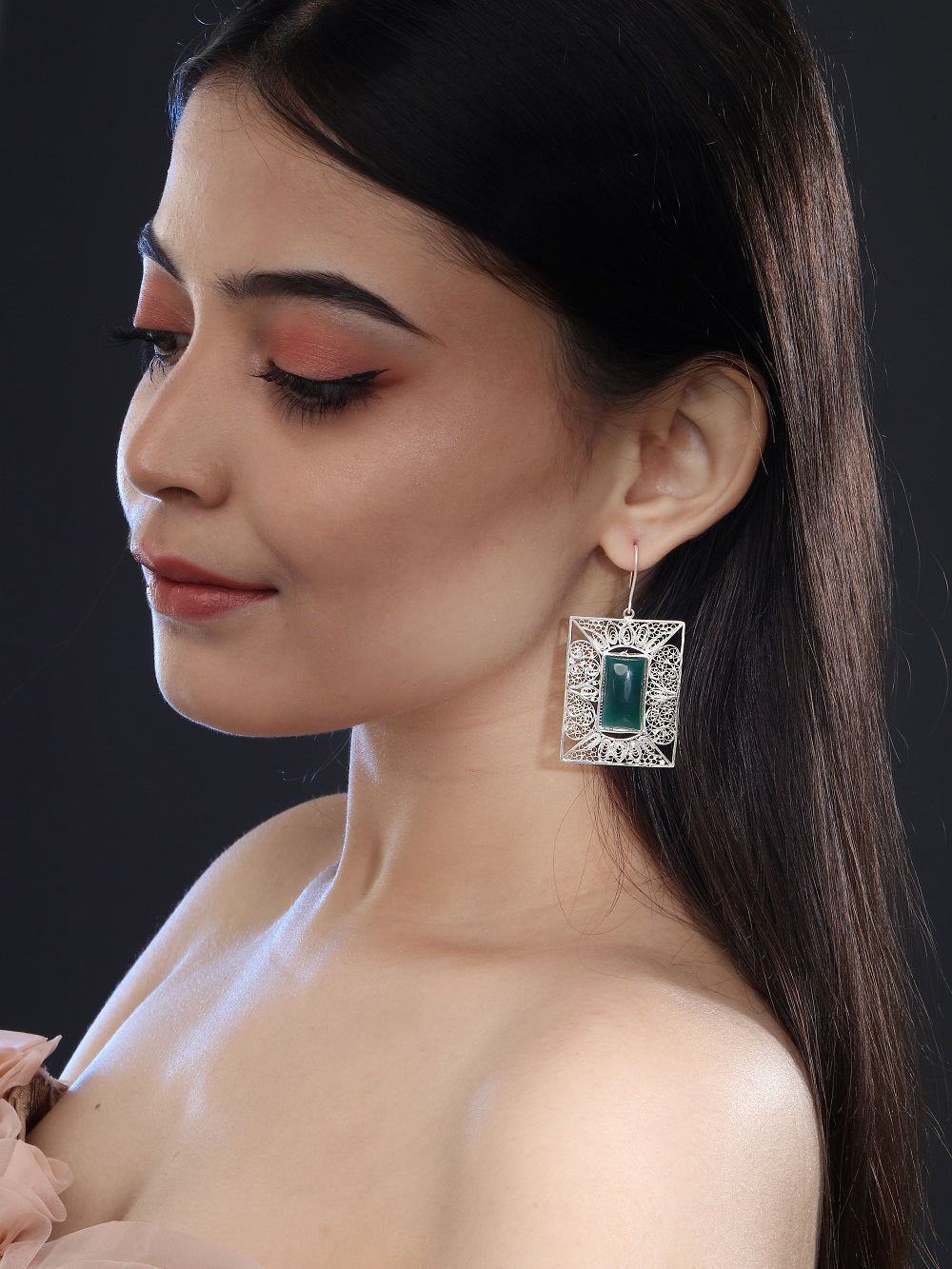 These unique pair of earrings with a pendant, draw inspiration from basic rectangular shape and is embellished with a big green agate crystal. The design is minimal and quite contemporary. This is an attempt to create a statement earring that keeps our roots alive. It is quintessentially feminine !!!