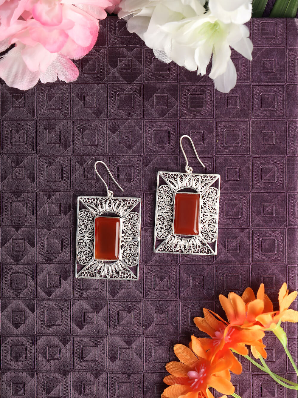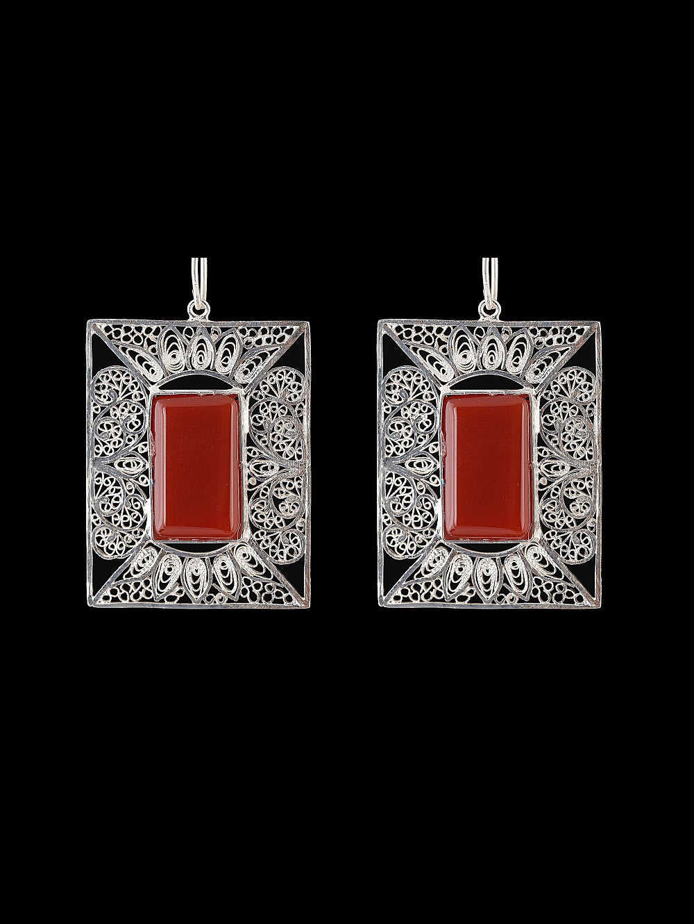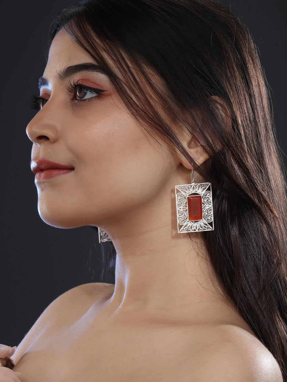 These unique pair of earrings with a pendant, draw inspiration from basic rectangular shape and is embellished with a big red agate crystal. The design is minimal and quite contemporary. This is an attempt to create a statement earring that keeps our roots alive. It is quintessentially feminine !!!