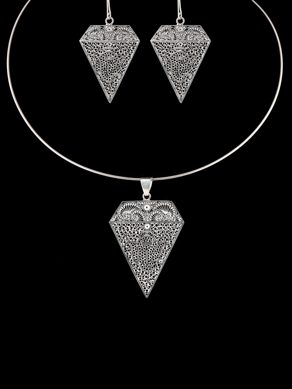 From the Indian roots of the brand into an elegant fusion of culture and modernity, this bold earring and pendant set is inspired by the Indian god Ganesha. They are a true statement of classiness and an amalgamation of bold clean strokes with beautiful organic lines.
