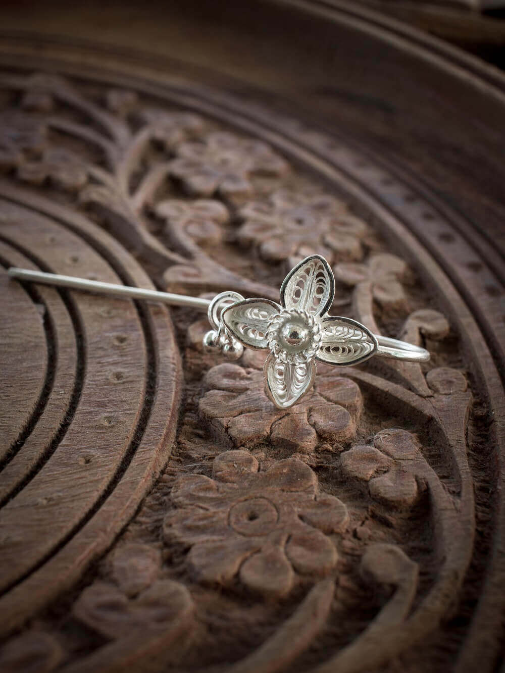 The silver filigree hair pin is an integral part of the Odissi Dance Jewellery. The hair is first tied neatly into a bun. Then the hair pin is worn on the center of the bun.