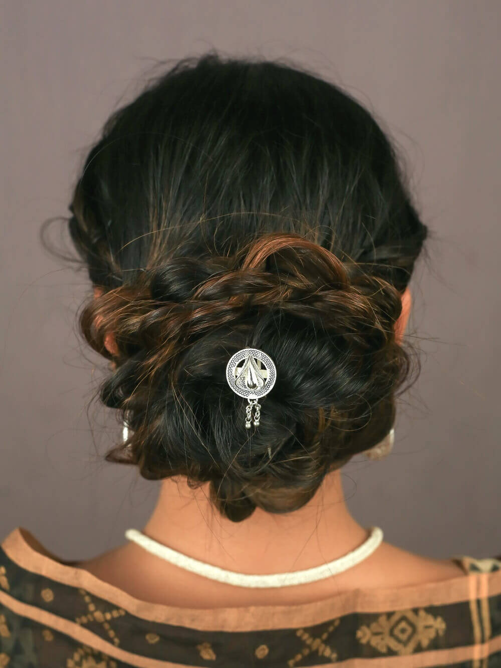 The silver filigree hair pin is an integral part of the Odissi Dance Jewellery. The hair is first tied neatly into a bun. Then a "Veni" or tiara is placed above the bun, and a hair pin is worn on the center of the bun.
