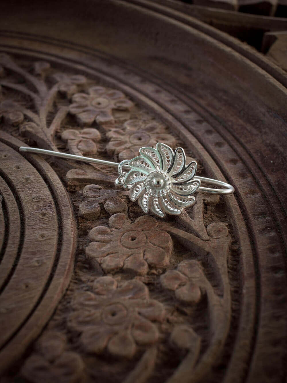 The silver filigree hair pin is an integral part of the Odissi Dance Jewellery. The hair is first tied neatly into a bun. Then the hair pin is worn on the center of the bun.
