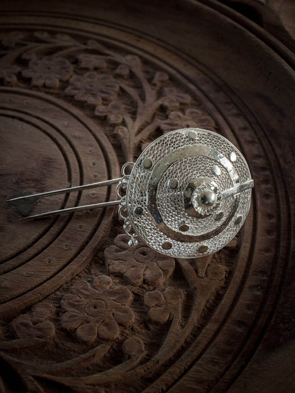 The silver filigree hair pin is an integral part of the Odissi Dance Jewellery. The hair is first tied neatly into a bun. Then a "Veni" or tiara is placed above the bun, and a hair pin is worn on the center of the bun.
