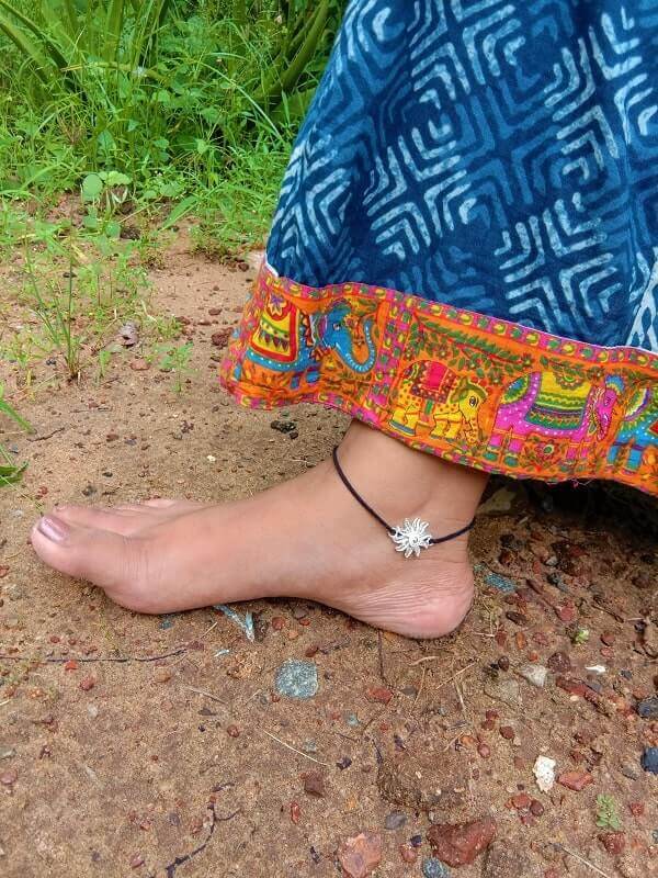 Nazar Battu Anklet is a black thread anklet worn to ward off the evil eye. This pretty nazarbattu is made of an intricate Silver Filigree Chakri inspired by Agni.