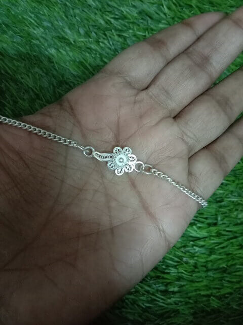 This Silver Anklet has a beautiful silver floral motif in the center and has silver chain. The anklet has an S shaped clasp. All our products are handmade in the fine art of Silver Filigree.