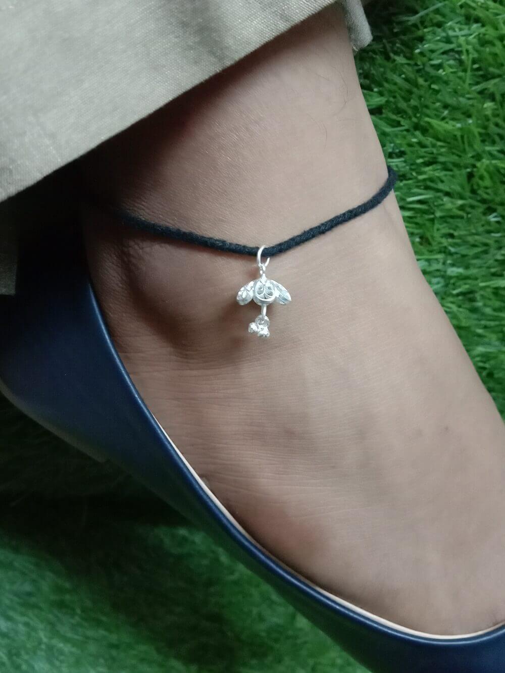Nazar Battu Anklet is a black thread anklet worn to ward off the evil eye. This pretty nazarbattu is made of an intricate Silver Filigree jhumki with tiny tinkerbells.