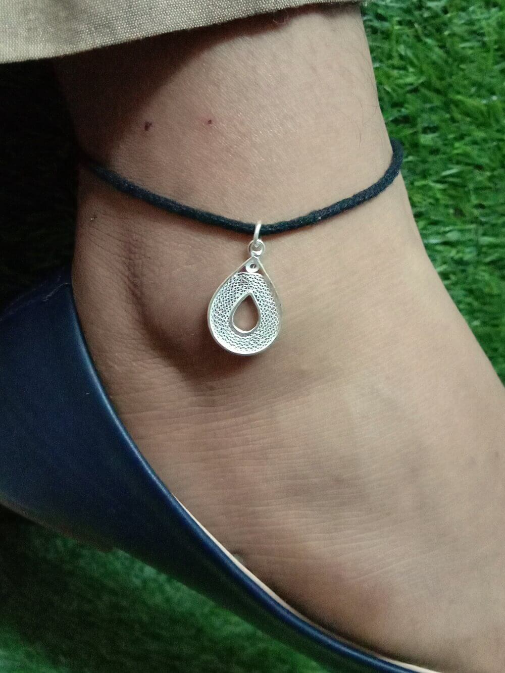 Nazar Battu Anklet is a black thread anklet worn to ward off the evil eye. This pretty nazarbattu is made of an intricate Silver Filigree Water droplet or Boond.