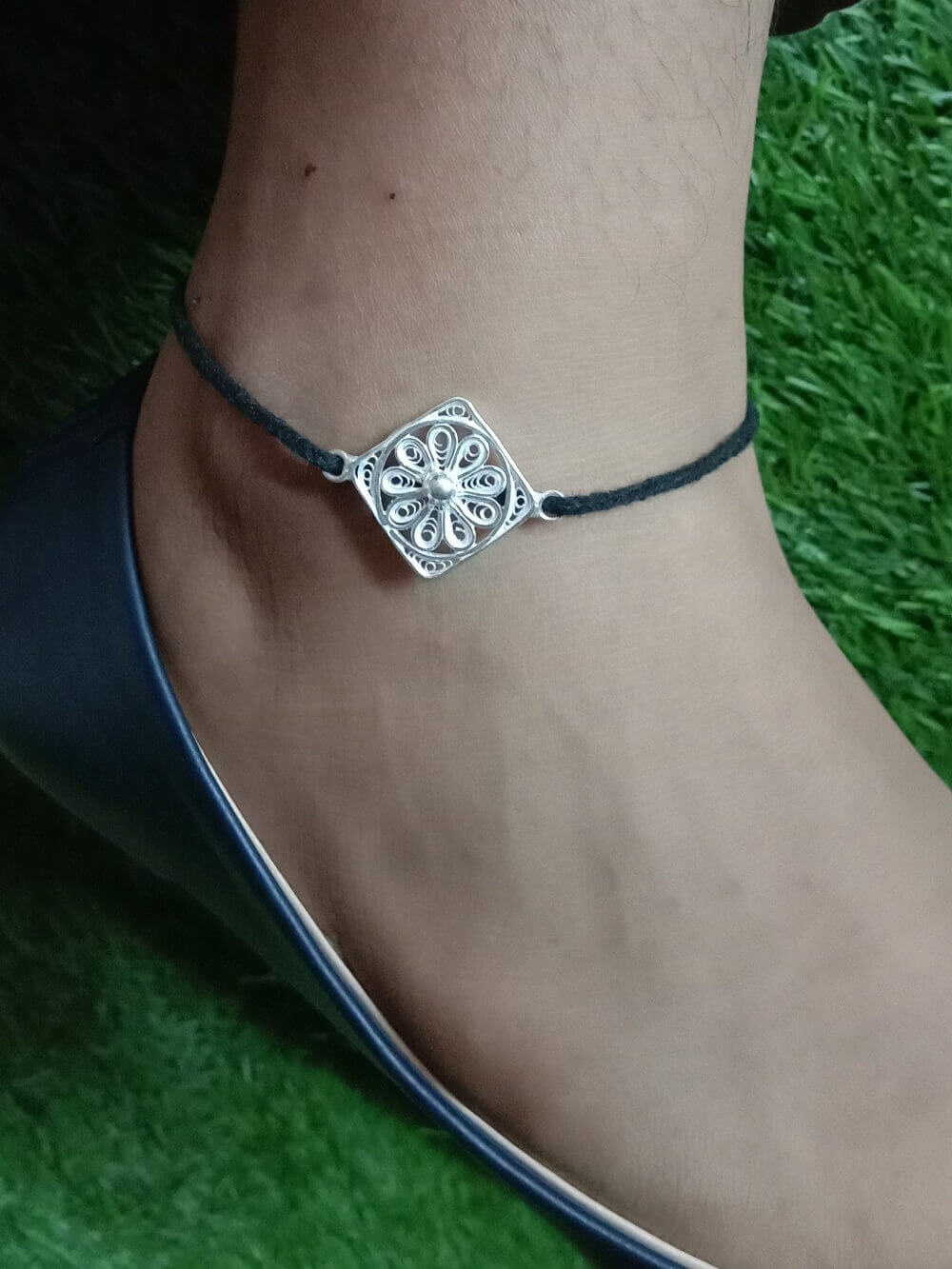 Nazar Battu Anklet is a black thread anklet worn to ward off the evil eye. This pretty nazarbattu is made of an intricate Silver Filigree Kite.