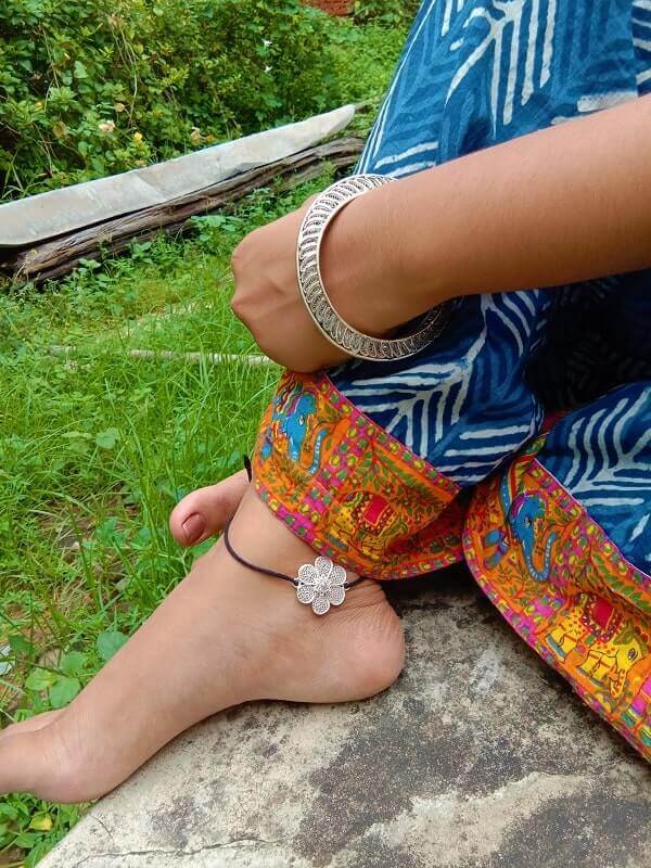 Nazar Battu Anklet is a black thread anklet worn to ward off the evil eye. This pretty nazarbattu is made of an intricate Silver Filigree Chakri inspired by the flowers.