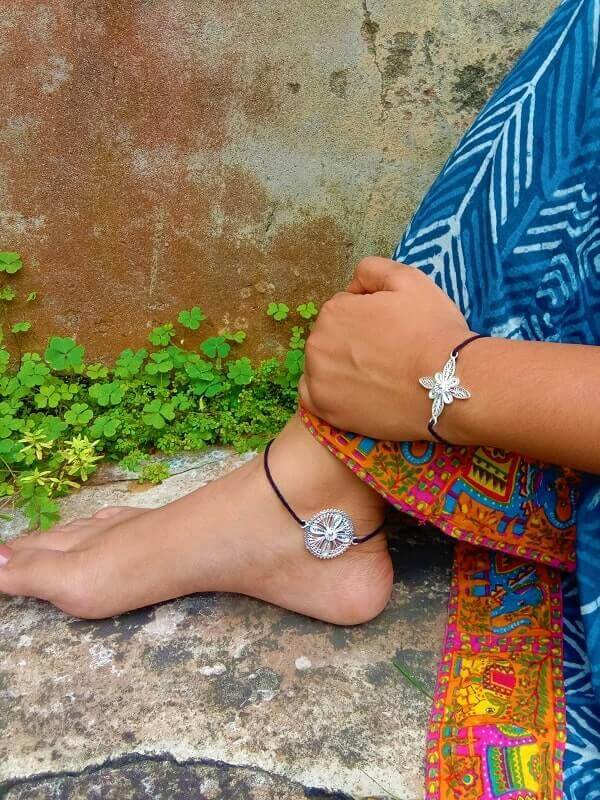Nazar Battu Anklet is a black thread anklet worn to ward off the evil eye. This pretty nazarbattu is made of an intricate Silver Filigree Chakri inspired by the Geranium.