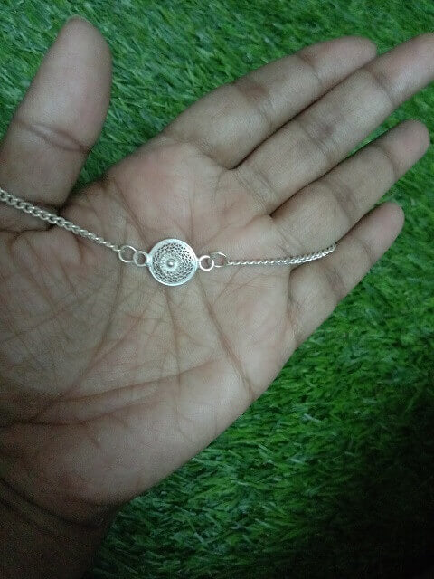 This Silver Anklet has a beautiful silver circular motif in the center and has silver chain. The anklet has an S shaped clasp. All our products are handmade in the fine art of Silver Filigree.