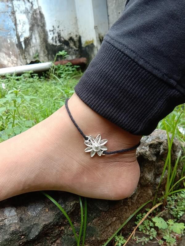 Nazar Battu Anklet is a black thread anklet worn to ward off the evil eye. This pretty nazarbattu is made of an intricate Silver Filigree charm inspired by the Stars.