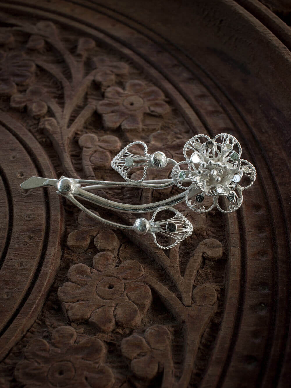 The Silver Filigree Saree Pin/ Brooch can be worn on Indian traditional costumes like Sarees and Salwaar Kameez, and on western outfits like jackets, shirts and t-shirts.