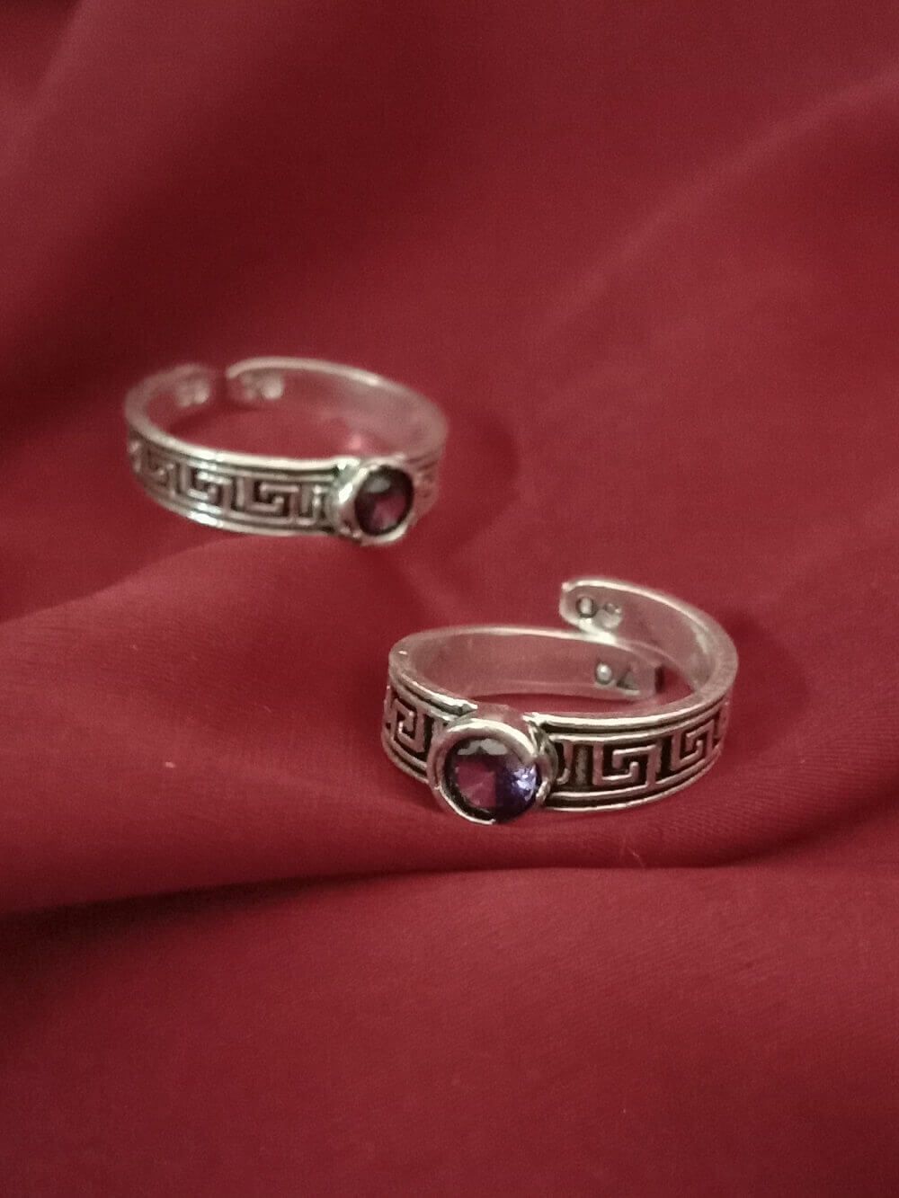 The silver oxidised toe ring is adjustable in size to fit any toe. The toe ring can also be worn on the thumb. This toe ring has a lovely purple stone embedded on it.