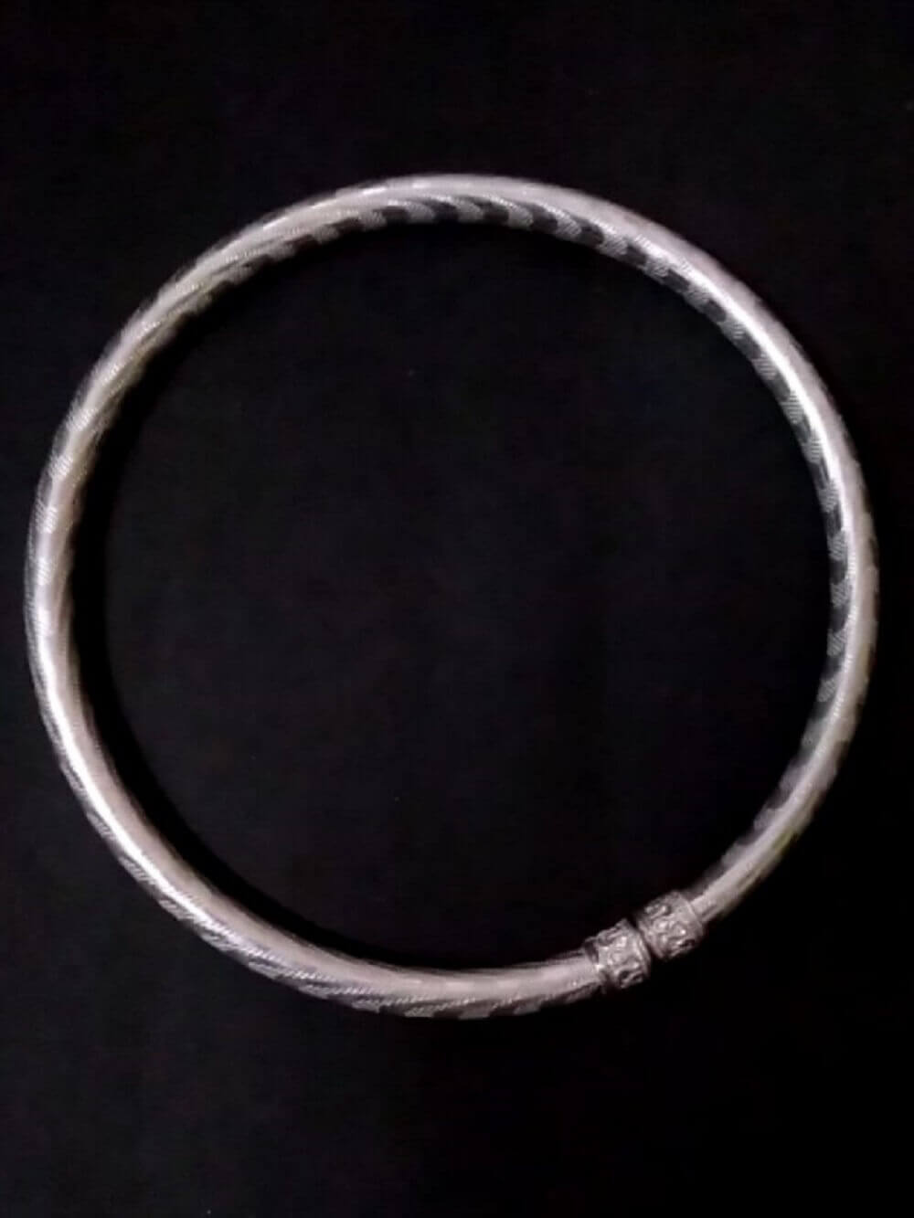 Anklet kadas were worn by tribal women. This kada has a beautiful pattern engraved throughout the kada. It can be twisted to open and fits any leg.