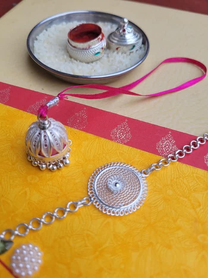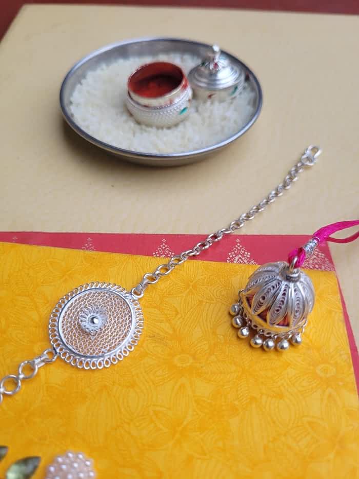 This Silver Filigree Rakhi is designed for the proud sister who wants her brother and bhabhi to stand out. The unique design reflects his individuality, just like your love for them.