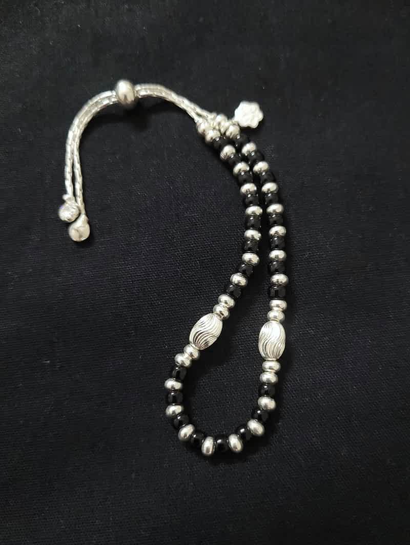 This Silver Black Beads Nazariya Bracelet is a perfect gift for your lady. Suitable for occasions like Birthdays, Festivals and Casual Gifting. The Silver Bracelet has black beads that ward off evil. The bracelet is adjustable in size.