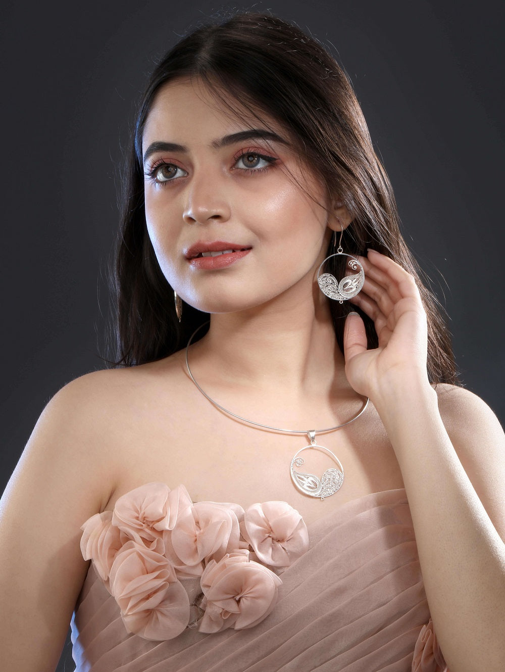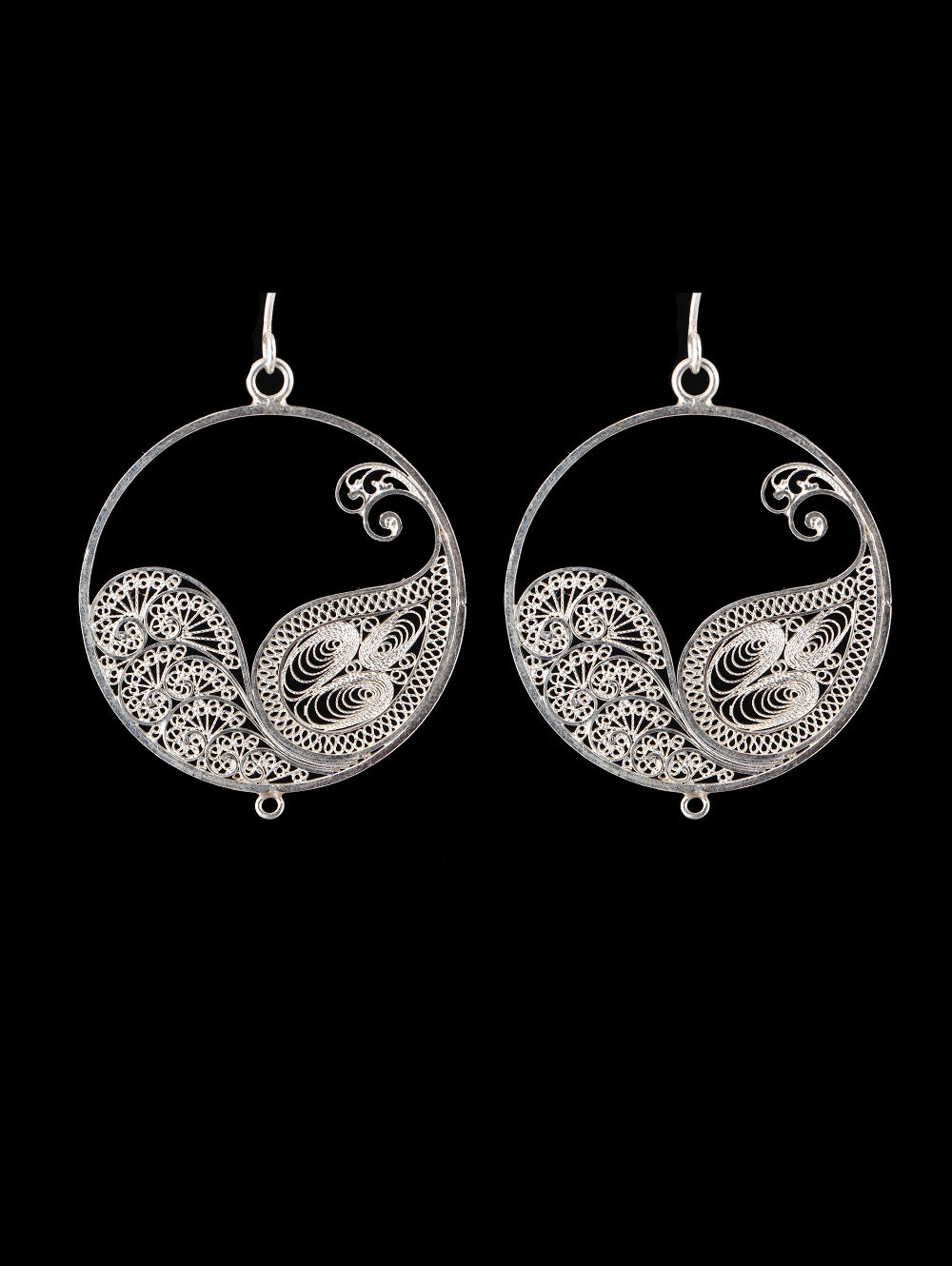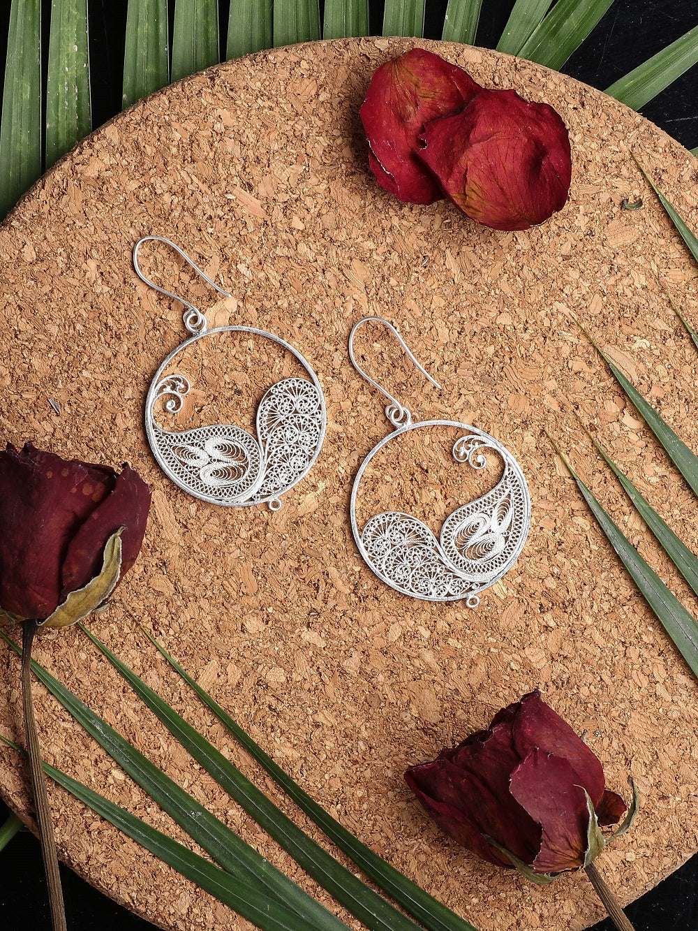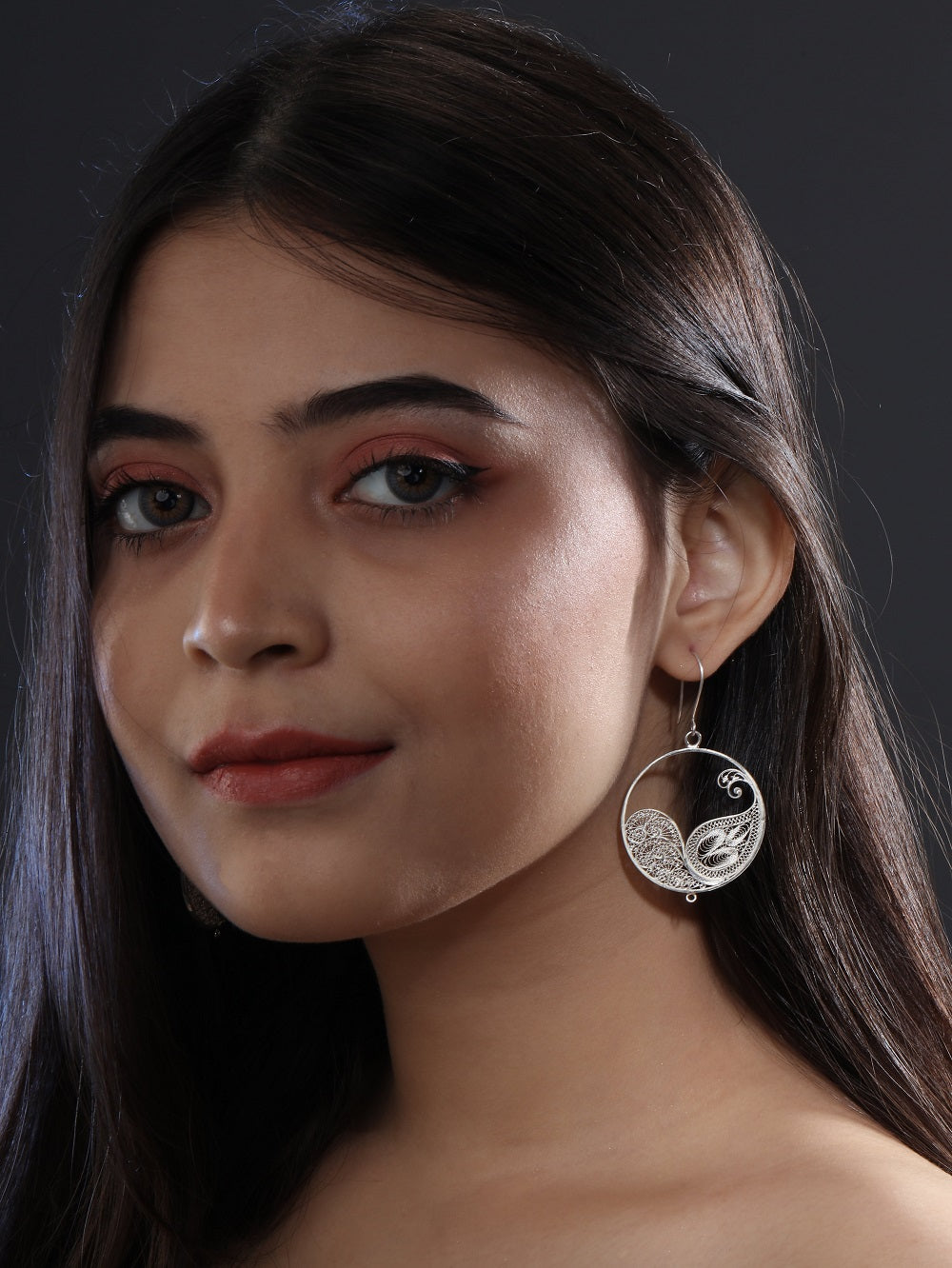This chaandbali (hoop) draws inspiration from the form and allure of a peacock; delicately trying to embrace its beauty and grace of its feathers that spread around, reflecting the legacy of India through organic linings of silver. Its quintessentially feminine and refined.