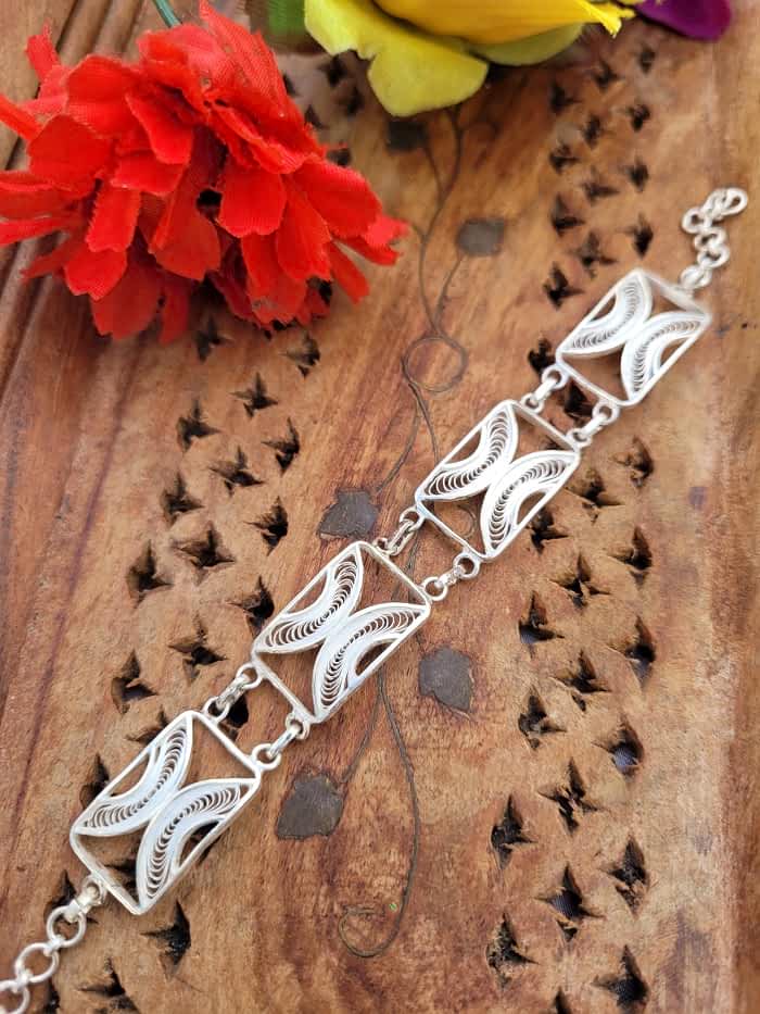 Elevate your style with the refined sophistication of our Rectangular Harmony Bracelet. This elegant piece is meticulously crafted from silver filigree, featuring a series of small, rectangular motifs that create a harmonious and modern design.