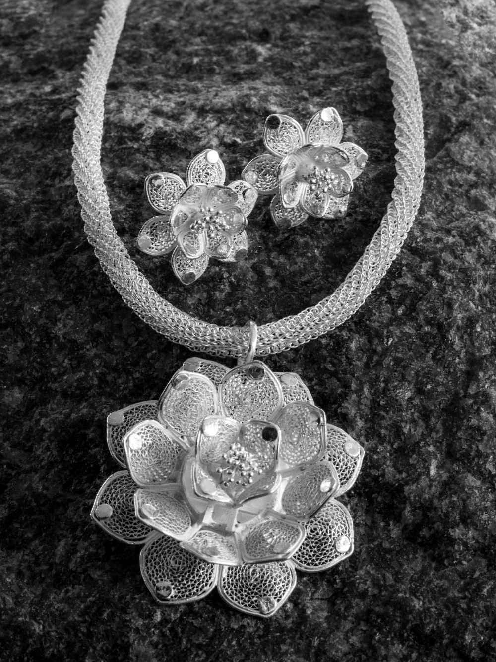 The pendant set comes with an intricate silver filigree chain.
