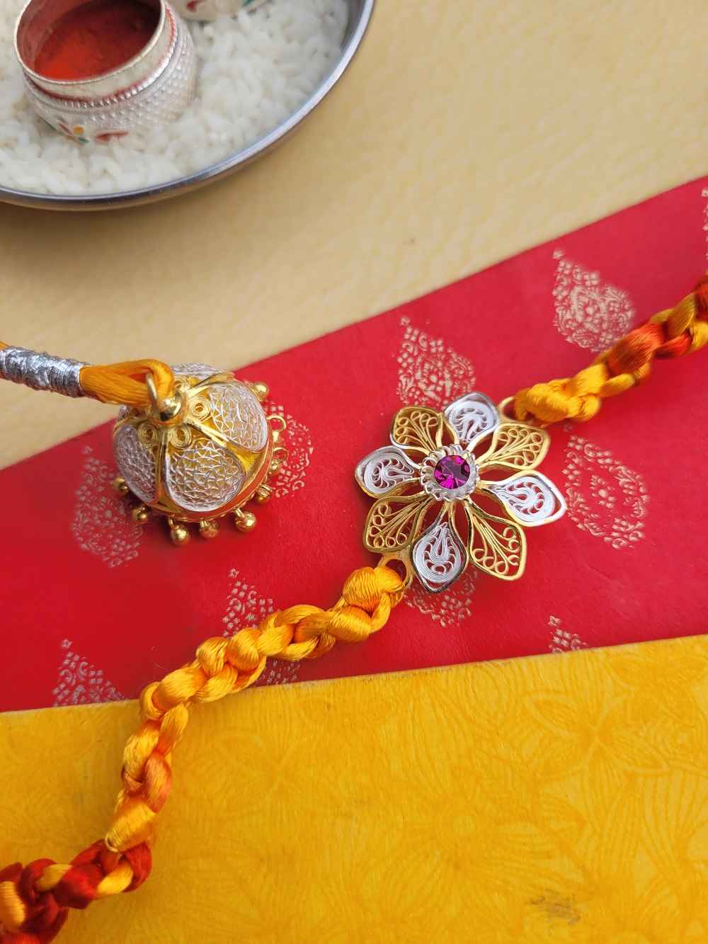 This Silver Rakhi, inspired by nature's beautiful petals, reflects your love for your brother. The dual-toned silver and gold motif signifies the strength and beauty of your bond.