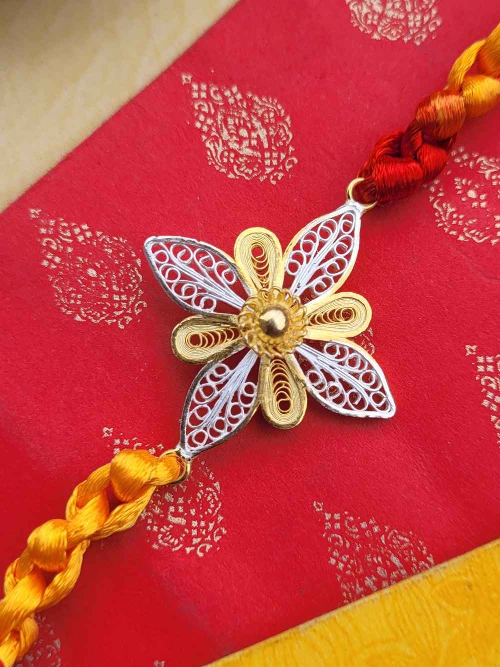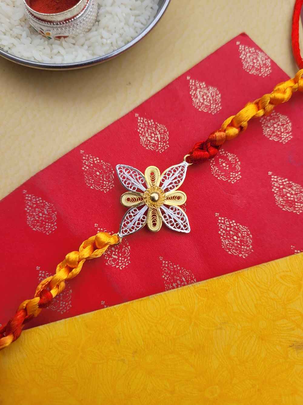 This Silver Rakhi, inspired by nature's petals, reflects the courage your brother gives you. The silver motif symbolizes his unwavering support.